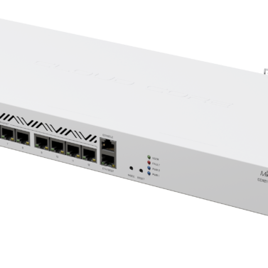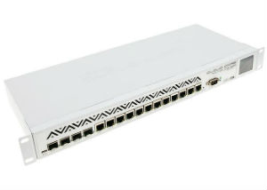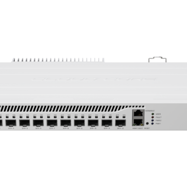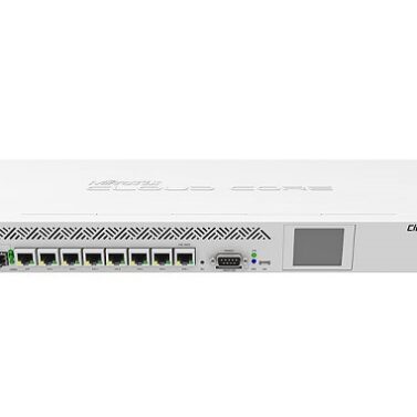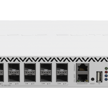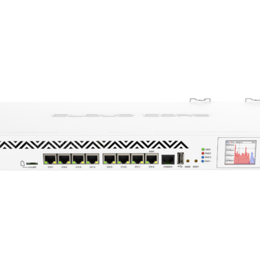 Montaje en rack 1U, 5xEthernet, 5xGigabit Ethernet, USB, LCD, salida PoE en el puerto 10, CPU de 600 MHz, 128 MB de RAM, RouterOS L5
