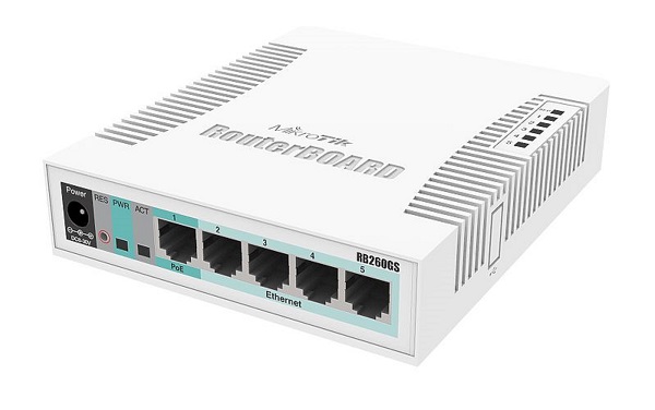 1U de montaje en rack, 5xEthernet, 5xGigabit Ethernet, salida PoE en el puerto 10, CPU de 600 MHz, 64 MB de RAM, RouterOS L4