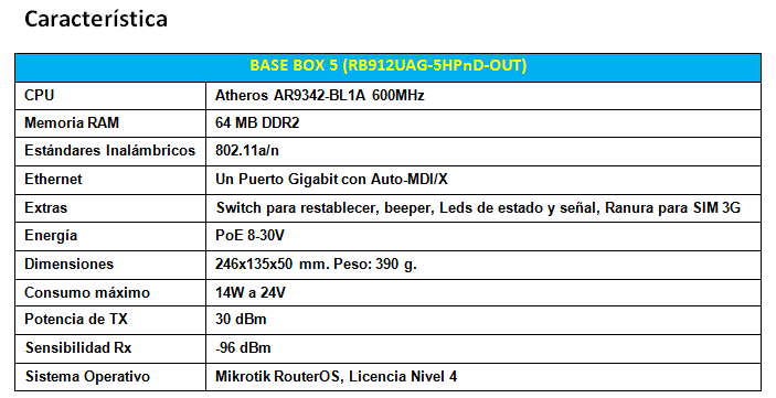 Este Base Box es un dispositivo inalámbrico para exteriores, basado en el popular modelo del Router RB912 que opera en la frecuencia de 5 GHz.