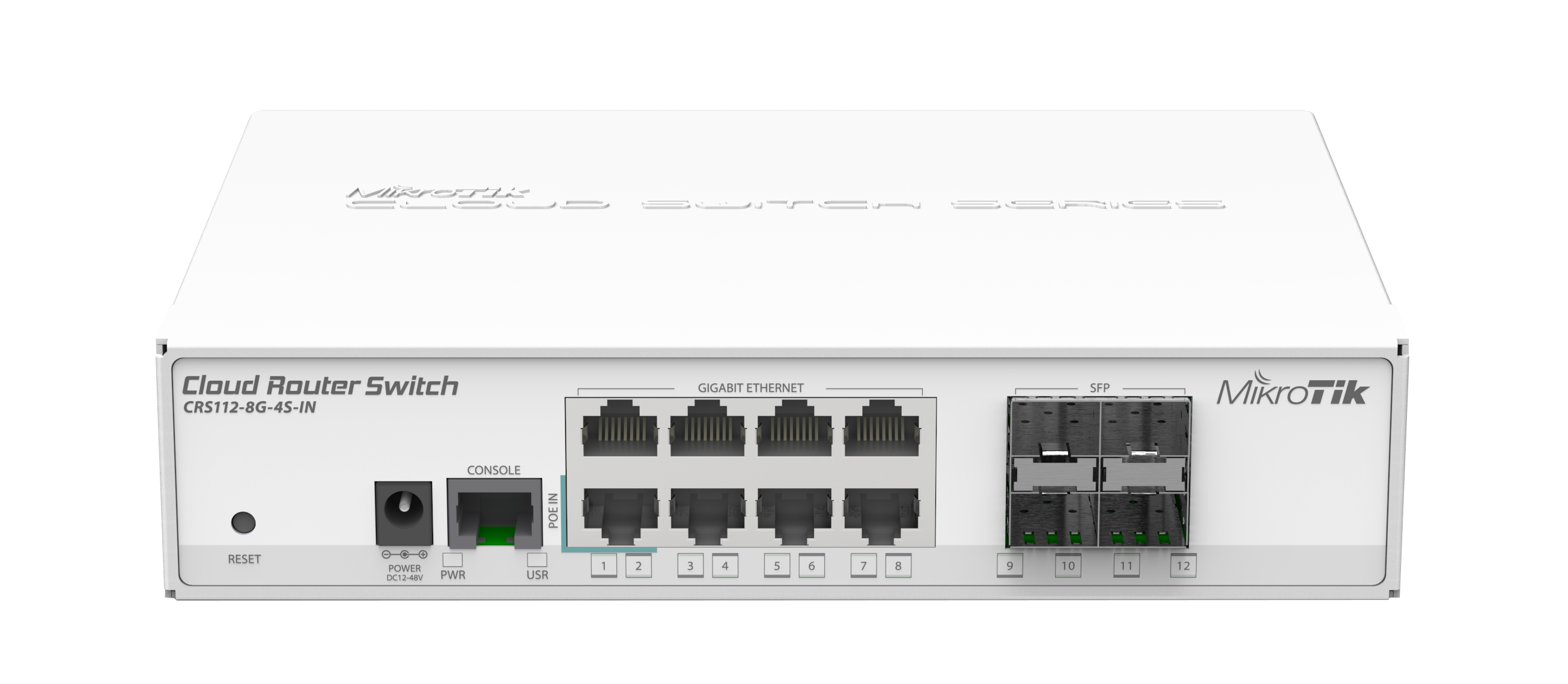 Cloud Router Switch 112-8G-4S-IN es un miembro de «tamaño pequeño y bajo costo» de nuestra serie CRS. Viene con ocho puertos Gigabit Ethernet y cuatro jaulas SFP.