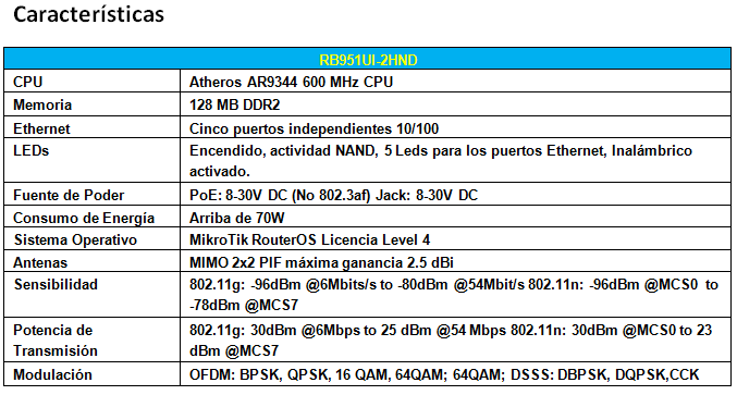 El CPU es a 600 MHz con 128  MB de memoria RAM y tecnología PoE (energía sobre Ethernet) de salida en los 5 puertos, por lo cual permite conectar dispositivos que cuenten también con tecnología PoE siempre y cuando requiera el mismo voltaje que otorga el RB951Ui-2HnD. La carga máxima en el puerto es de 500mA.
